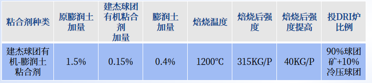 方法:鐵精礦粉中加入建杰球團(tuán)有機(jī)粘合劑與部分膨潤(rùn)土混勻后,利用圓盤(pán)造粒成型技術(shù),制備成強(qiáng)度合適的球團(tuán),經(jīng)焙燒成鐵礦球團(tuán)再投爐使用。